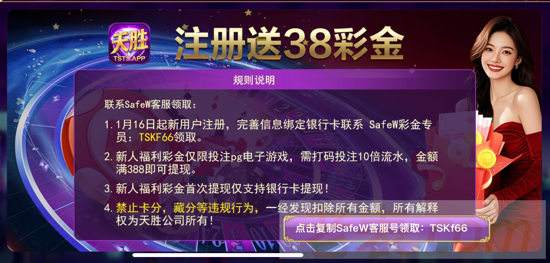 新用户注册绑卡,完善信息联系SafeW彩金客服领取!