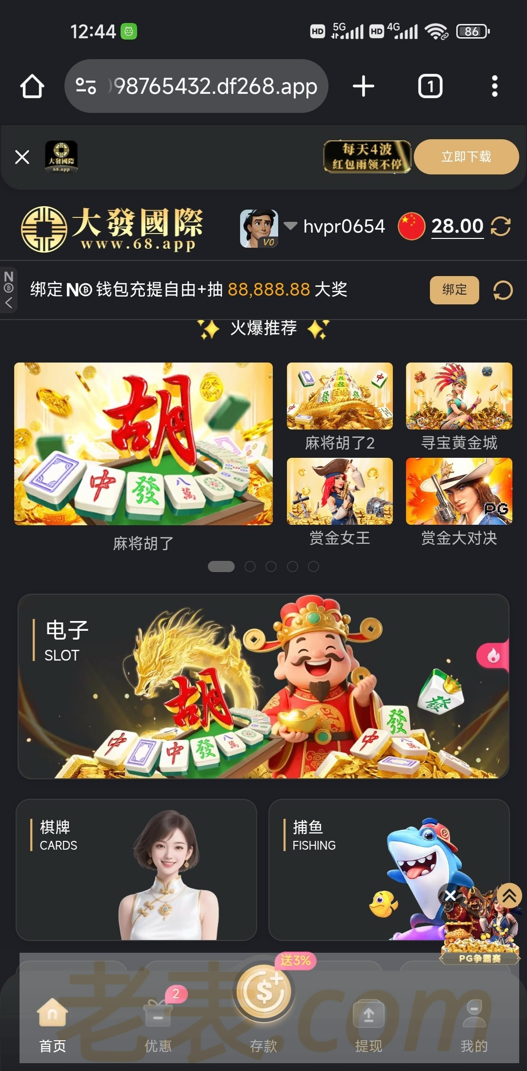 我是接到电话注册的 去优惠领取验证码绑定收款方式就领到了 优惠中心有两个28入口,一个是电话特邀免费28 一个是当日冲100领28 没入口的就是没有