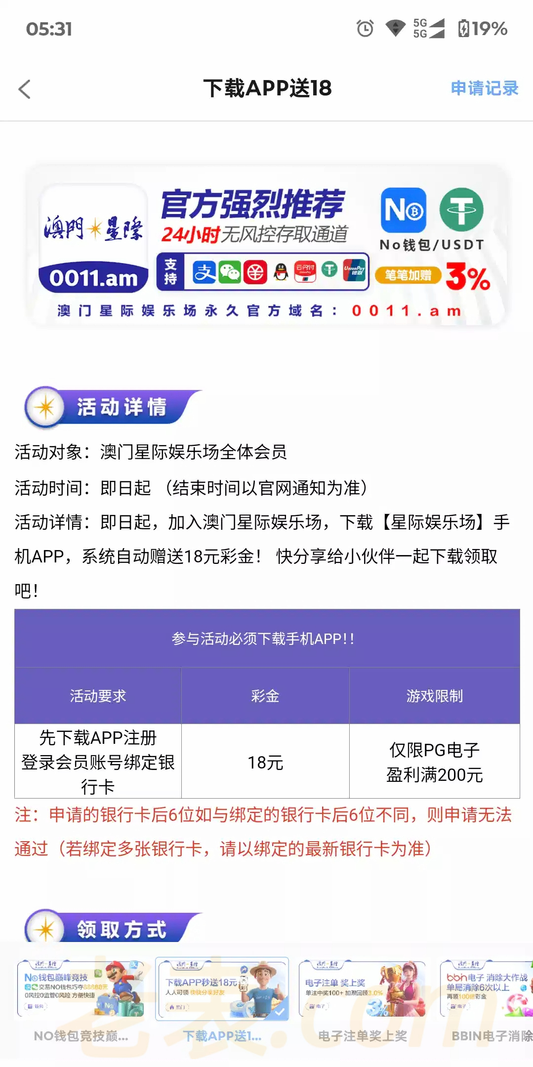 刚有老哥发自助的,活动有下载彩金